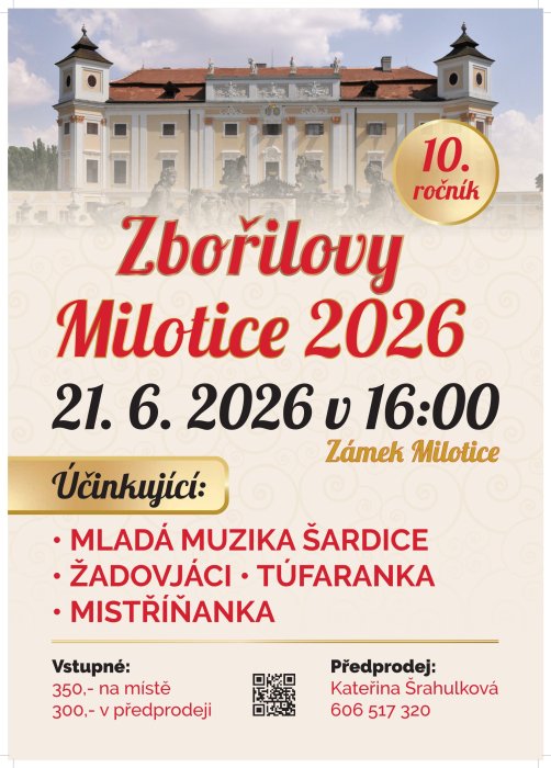 Prožijte nezapomenutelné nedělní odpoledne plné krásné hudby a malebného prostředí Zámku v Miloticích v neděli 21. června 2026 v 16 hodin. Naše pozvání přijaly kapely Mladá muzika Šardice, Žadovjáci, Túfaranka a na závěr Mistříňanka. Budeme se na Vás těšit na hospodářském nádvoří Zámku Milotice.